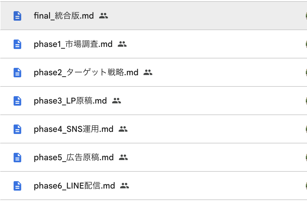 - 実際の出力事例(複数プロジェクトの成果物ファイルを共有)
