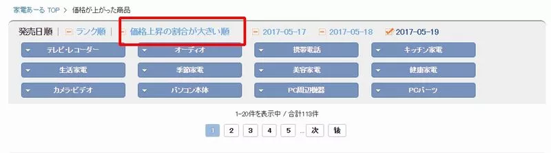 「価格が上がった商品⇒価格上昇の割合が大きい順」に並べると効率よく商品を探し出すことが出来ます。